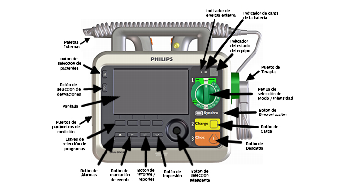 • El dispositivo se enciende en el modo de desfibrilación manual listo para aplicar una descarga en menos de: